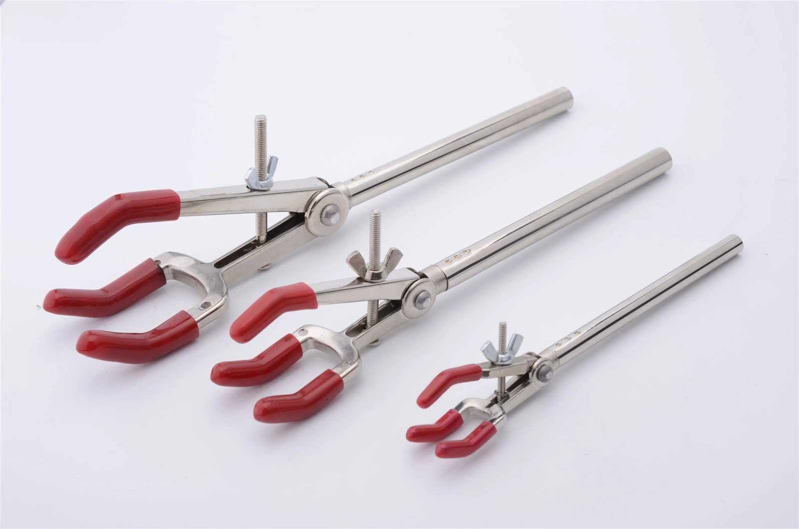 Pinzas de extensión metálicas con acabado Ni/Cr. Versiones de 3 puntas (sujeción envolvente) y 2 puntas (buretas/termómetros), con aperturas entre 0 y 108 mm.